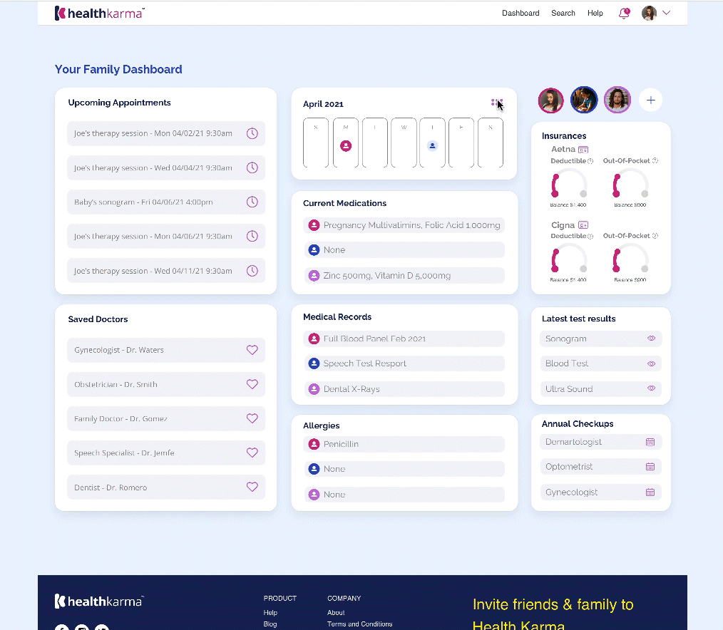 As a team we were challenged to create a digital platform that allows users to manage their families healthcare information in a centralized way. The initiative was to relieve the stress of having to manage individual family members' insurance, medical, and appointment related healthcare information.